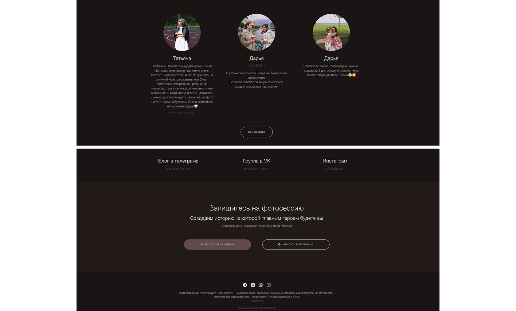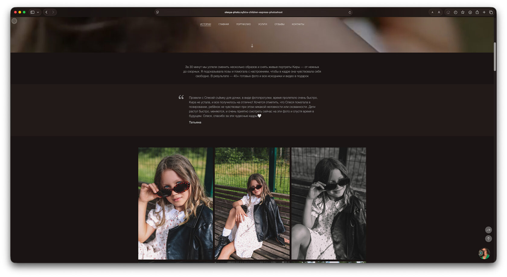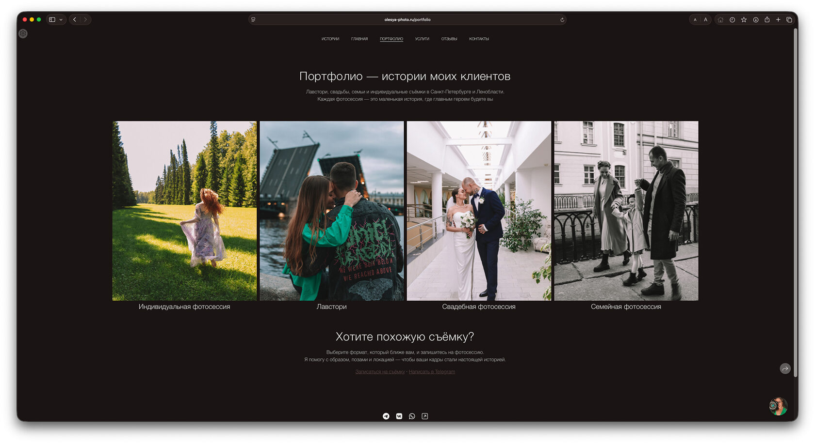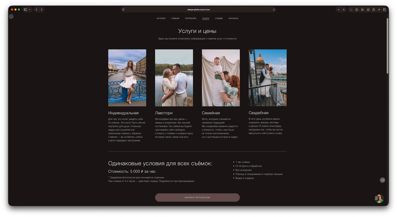 У Олеси были активные соцсети и портфолио, но сайт отсутствовал. Задача: запустить быстрый, «лёгкий» и понятный сайт, который: